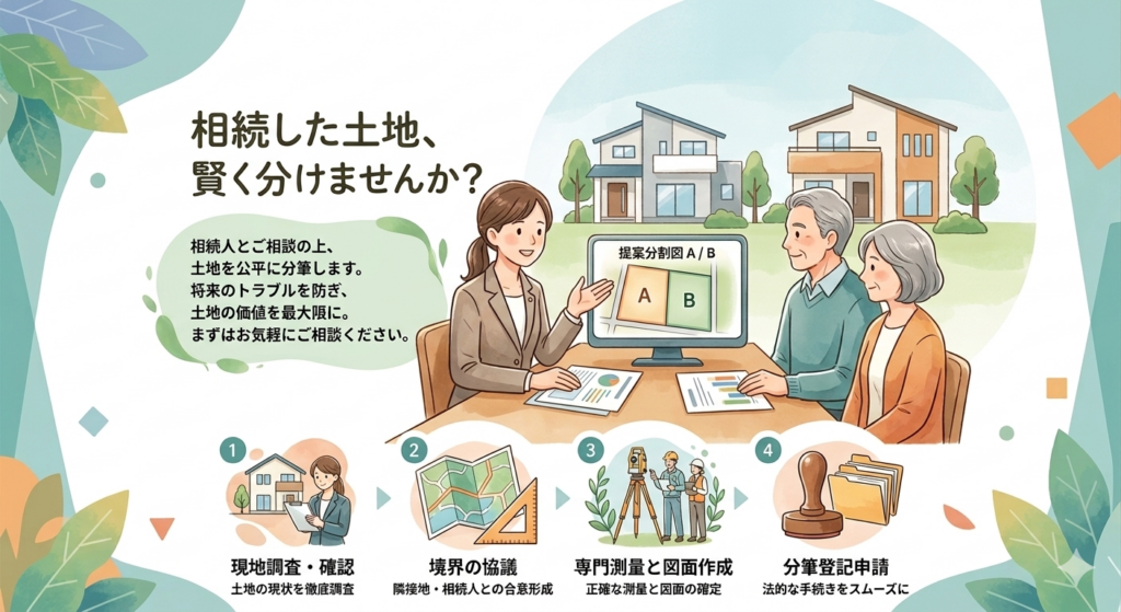 相続した土地の分割や分筆登記についてお困りの場合はお気軽にご相談ください。